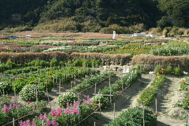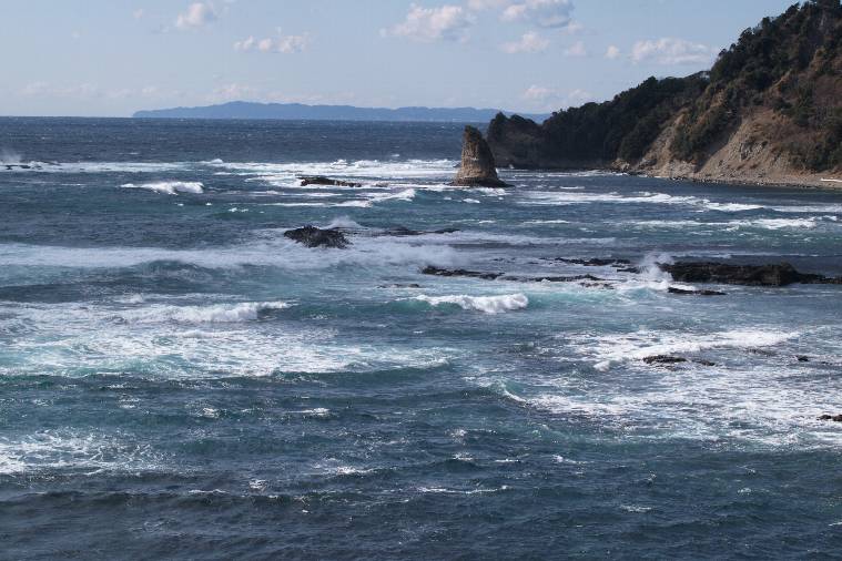 今日は大網白里町から九十九里浜に出て、冬の房総半島一周です。さすがに海岸での人影はまばらですが、青い海と北風に逆らって砕ける波しぶきがきれいです。半島先端の白浜町では、あちこちに立つ”花つみ”ののぼり