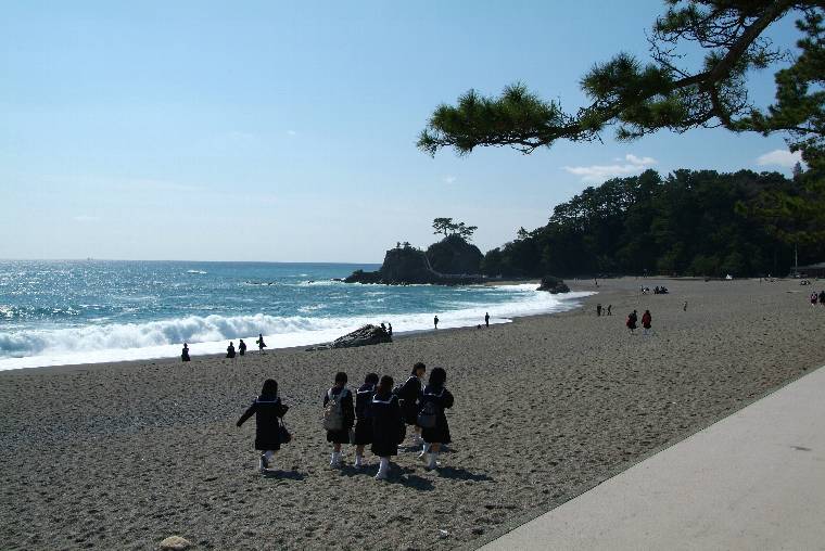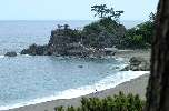 太平洋の波が砕ける桂浜、坂本龍馬の大きな像が海に向かって立っています。台風で痛めつけられた海岸の松林も、回復して濃い緑になりました。