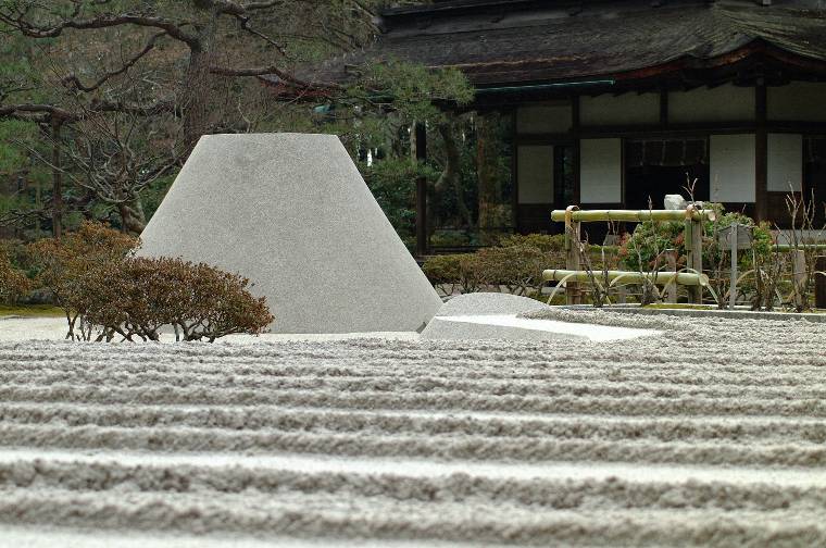 冬の銀閣寺。雪がないのが残念ですが、訪れる人も少なく、きりっとした風景です。広い庭園では随所に万両などの赤い実がかがやき、職人さんたちは庭木の手入れに余念がありません。門前の哲学の道も今は閑散としています。(2004.1.21.) ( 銀閣寺および庭園の写真は転用しないでください。) |