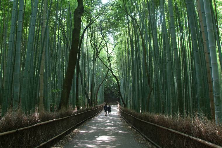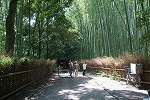 ■ トロッコ列車を嵐山駅で降りて竹林の小径から渡月橋へと歩きます。6月の竹林は竹の子が皮を脱いだばかりの新しい緑が鮮やかです。人気の渡月橋では舞妓さんになりきったお二人 さんもみんなの注目の中をしゃらしゃらと歩いています。(2009.6.6.) |