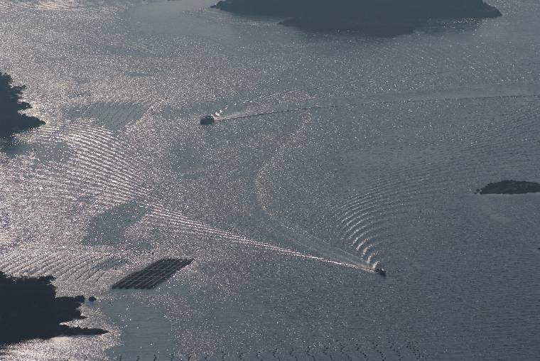 ■ 今日は360度を見渡す佐世保市石岳展望台に立って、憧れの西海国立公園・九十九島の夕景です。あいにくのモヤと雲で真っ赤な夕焼けとは いきませんが、鉛を溶かしたような銀色の水面に漁船の波紋が流れます。 青い海と緑の島の風景は宿題です。(2008.2.21.) |