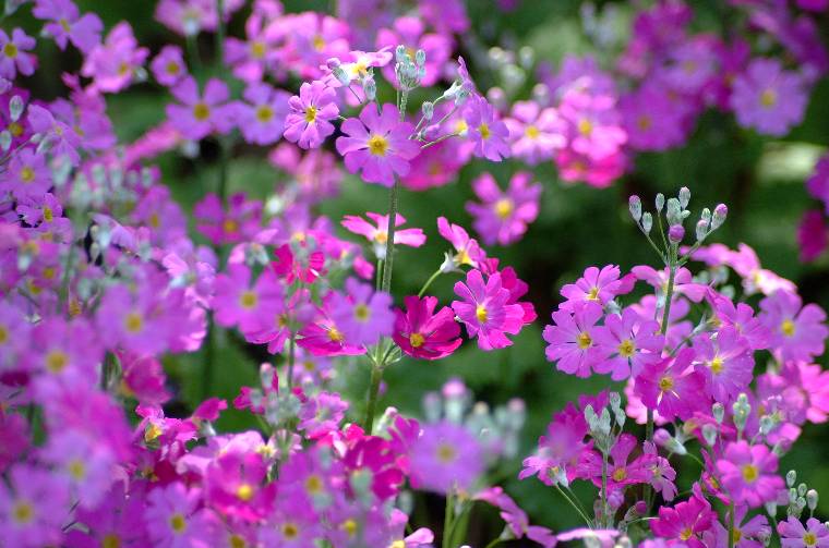 花が終わったプランター からタネがこぼれて、木漏れ日の庭にさくら草の茂みがしだいに大きくなってきました。林の中の湿度の高い空気とやわらかい日差しの中で、ひときわ鮮やかでみずみずしい花を咲かせています。