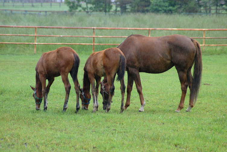●●● 苫小牧から襟裳岬までの国道235号沿いには、いたるところに競走馬の牧場が広がっています。サラブレッドの子馬達は母親のそばを離れることはありません。(2001.7.9.) |