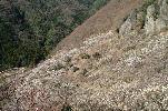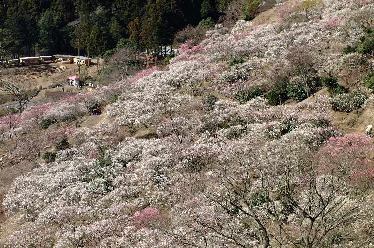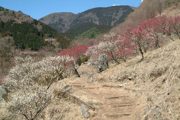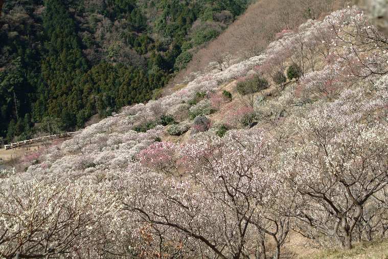 ●●● 「湯河原梅林」は、開園8周年の若い梅林ですが、雄大な幕山(625m)の裾野に立地する気持ちのよいところです。町おこし策として開発されたそうで、幕山登山の人、ロッククライミングの人、それに多くの観梅の人達で、狙いバッチリのにぎわいです。(2003.3.10.) |