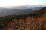 ●●● 乗鞍岳山頂付近、乗鞍スカイラインから見た日の出です。空の青みが朱色に変わって、あっという間に太陽が顔を出します。朝霧は太陽に輝き、紅葉が色を付けていきます。山並み左端のトンガリは富士山。秋の連休で、車もカメラマンも行列です。(2002.10.13.) |