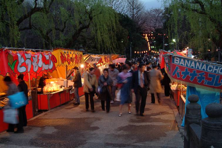 | 夜の弁天堂 | 夜桜の下では宴会が盛り上がっている | ||