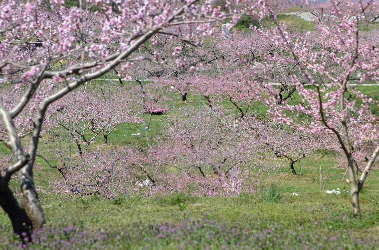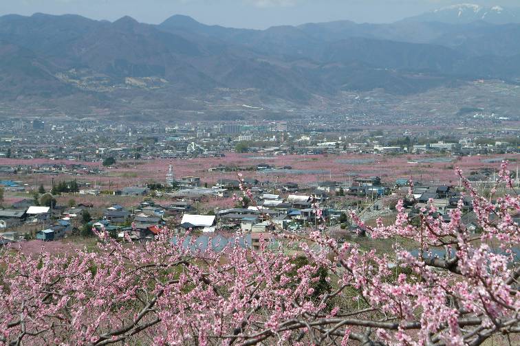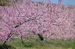 ●●●甲府盆地をピンク色に染めて桃の花が満開です。いっせいに開花した花は、農家の人たちが一花一花吟味をしながら摘花するというたいへんな作業で、その後には 花びらのじゅうたんができます。白い花はスモモです。(2003.4.16.、2007.4.14.) |