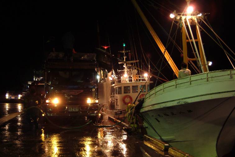 ■ 九十九里浜をどんどん北上して、銚子市の手前が飯岡町。その漁港を見下ろす刑部(ぎょうぶ)岬は、すばらしい夕日展望のスポットで、九十九里浜のかなたに大きな太陽が沈みます。漁港では夜もカタクチイワシの水揚げで、大型トラックが行き交います。(2003.12.8.〜9.) |