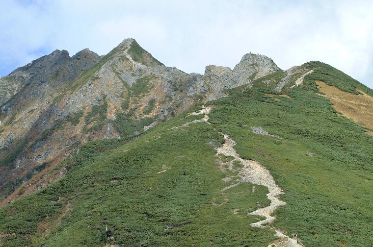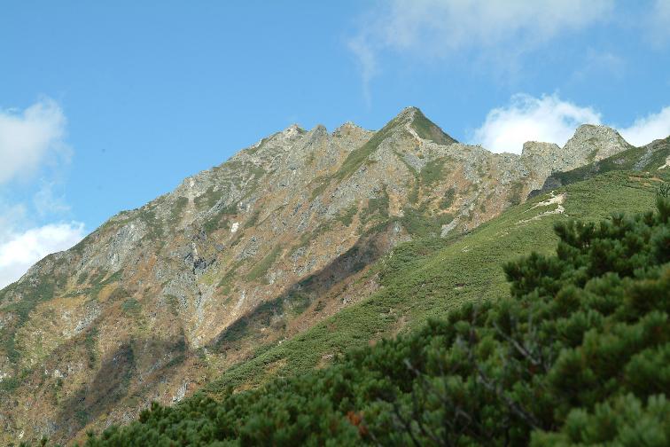●●● 今日はあこがれの北アルプス穂高の山々です。新穂高温泉からロープウェイに乗って、西穂高口(2156m)。ここで入山届けを出して、2385mの西穂山荘をめざします。 運良くガスが晴れて、穂高の山々も顔を見せ、下には上高地が見えています。(2003.9.29.) |