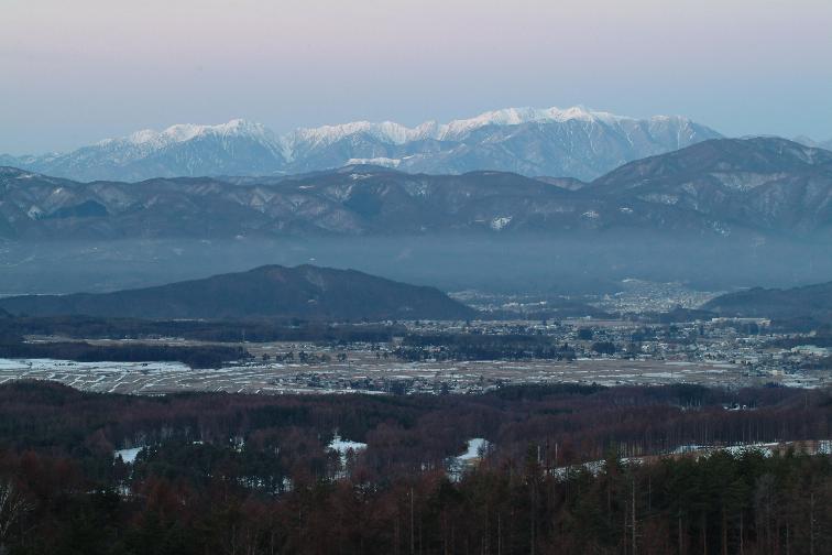 ■ 蓼科高原の高台に立つと、南アルプス、中央アルプス、北アルプスの山々がぐるっと眺望できます。 ひときわ大きい御岳山に朝日の紅がさしたかと思うと、あっという間に周りの山々が明るくなっていきます。夜は茅野市の夜景がきれいです。(2004.2.24.) |