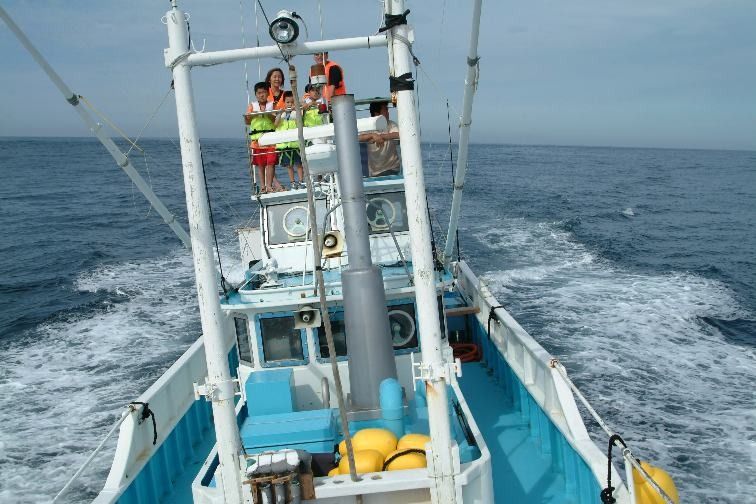 ●●●ホエールウオッチングのもうひとつの楽しみは外洋クルージングです。 船は黒潮の外洋を全速力で突っ走り、波のうねりを乗り越えたり、左右に大きくドズかれたり。童心に帰って、船端にしっかりとつかまって大海原の風景を体感しよう。 (2003.7.24〜25.) |
