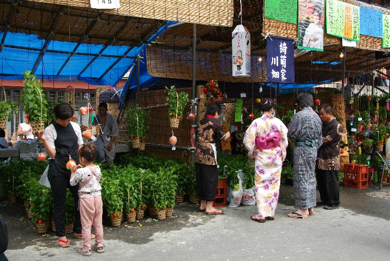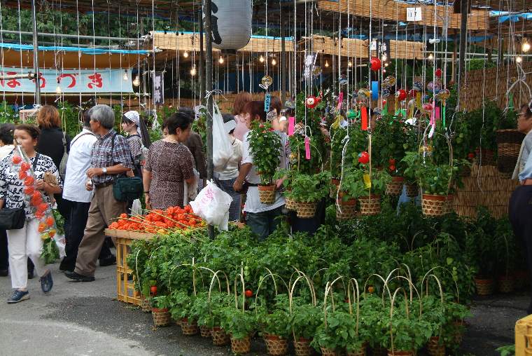 こちらもお祭りスタイルの売り子さんが、”いいのがあるよ”との威勢のいい売込み。カメラマンも目立って多くて、商売の邪魔してゴメンナサイ。(2004.7.9.&2007.7.9.) |