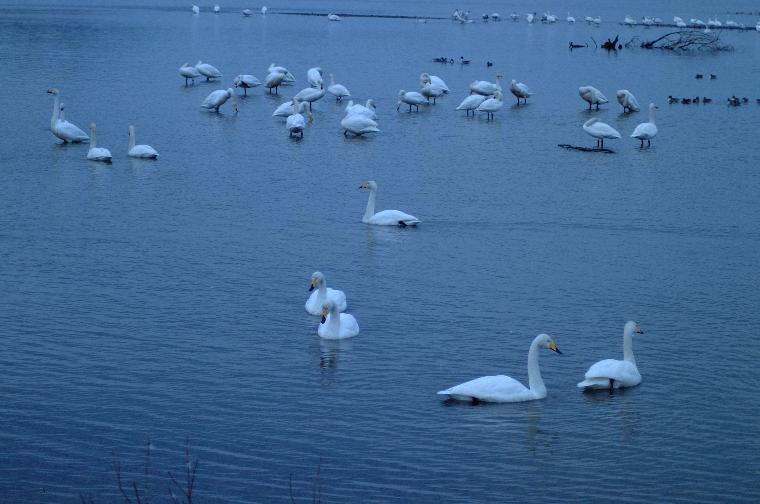 ■ 庄内平野の田園に白鳥たちが暮らしています。雪の積もる田んぼで、せっせと泥をすくいながら、にぎやかに鳴き声を上げ、気ままに飛来しては、また飛び立っていきます。美しい田園が育てる大型の美しい鳥たちです。(2004.2.17.) |
