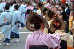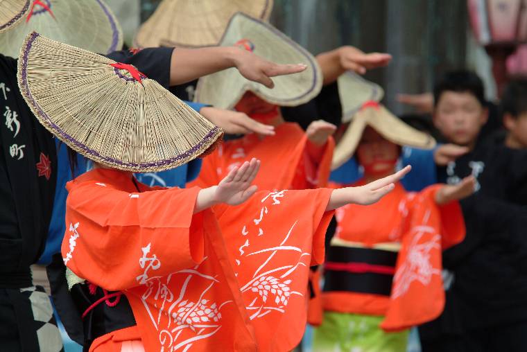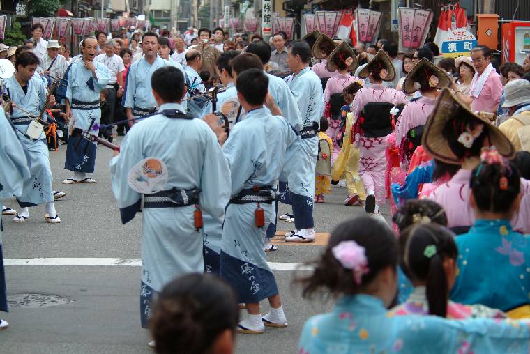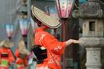■ 富山市になった八尾町。今年も風の盆に多くの人が集まります。8月に徳島の阿波踊りを見てきた後では、大きく違う祭りの趣ですが、 やっぱりここにも3歳の童子から育まれた伝統が流れます。編み笠をとると、本当に若い若い踊り手さんたちの玄人の踊りです。(2005.9.2.) |